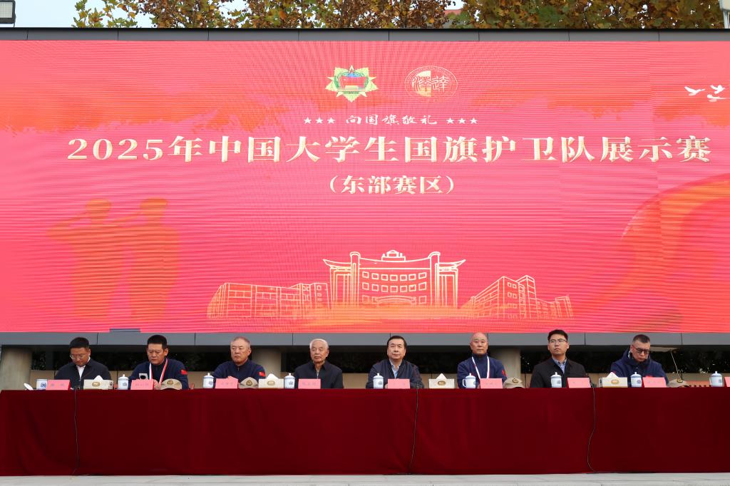 教育部全国学生资助管理中心原党总支副书记、中国学生体育联合会纪律与监督委员会委员左涛庄严宣布:“2025年中国大学生国旗护卫队展示赛(东部赛区)闭幕!”
