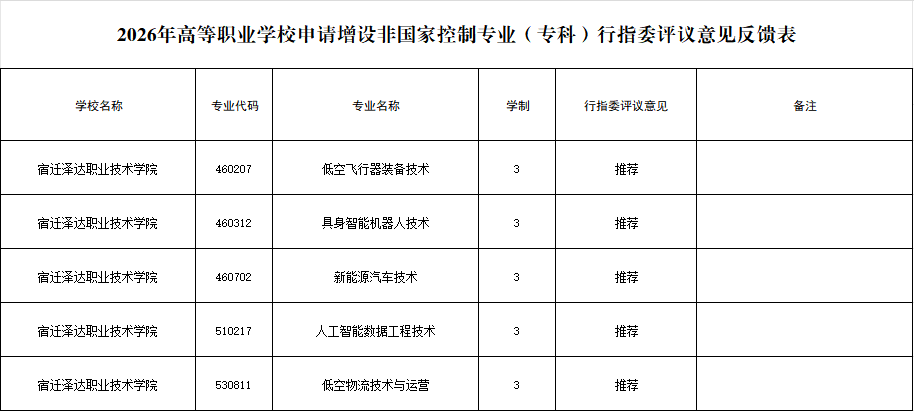 近日,宿迁泽达职业技术学院申报的低空飞行器装备技术等 5 个新专业,顺利通过省教育厅审核并正式上报教育部备案。