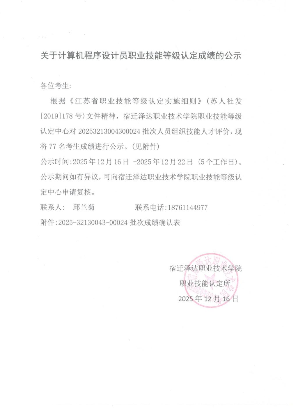 职业技能等级认定成绩公示(批次号2025-32130043-00024)