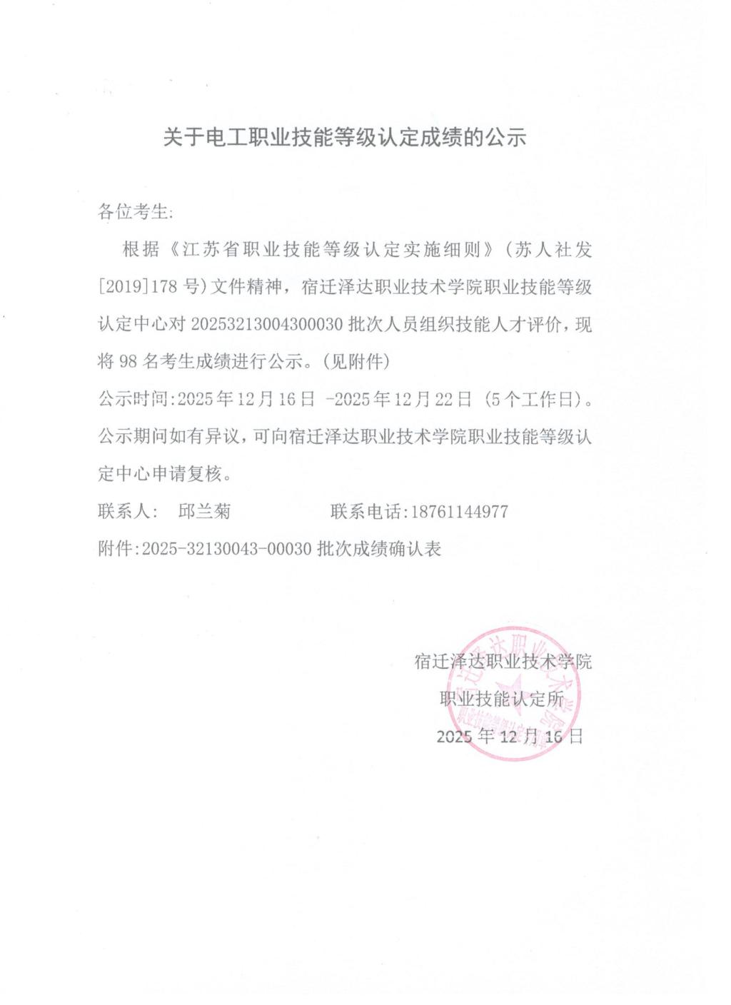 职业技能等级认定成绩公示(批次号2025-32130043-00030)