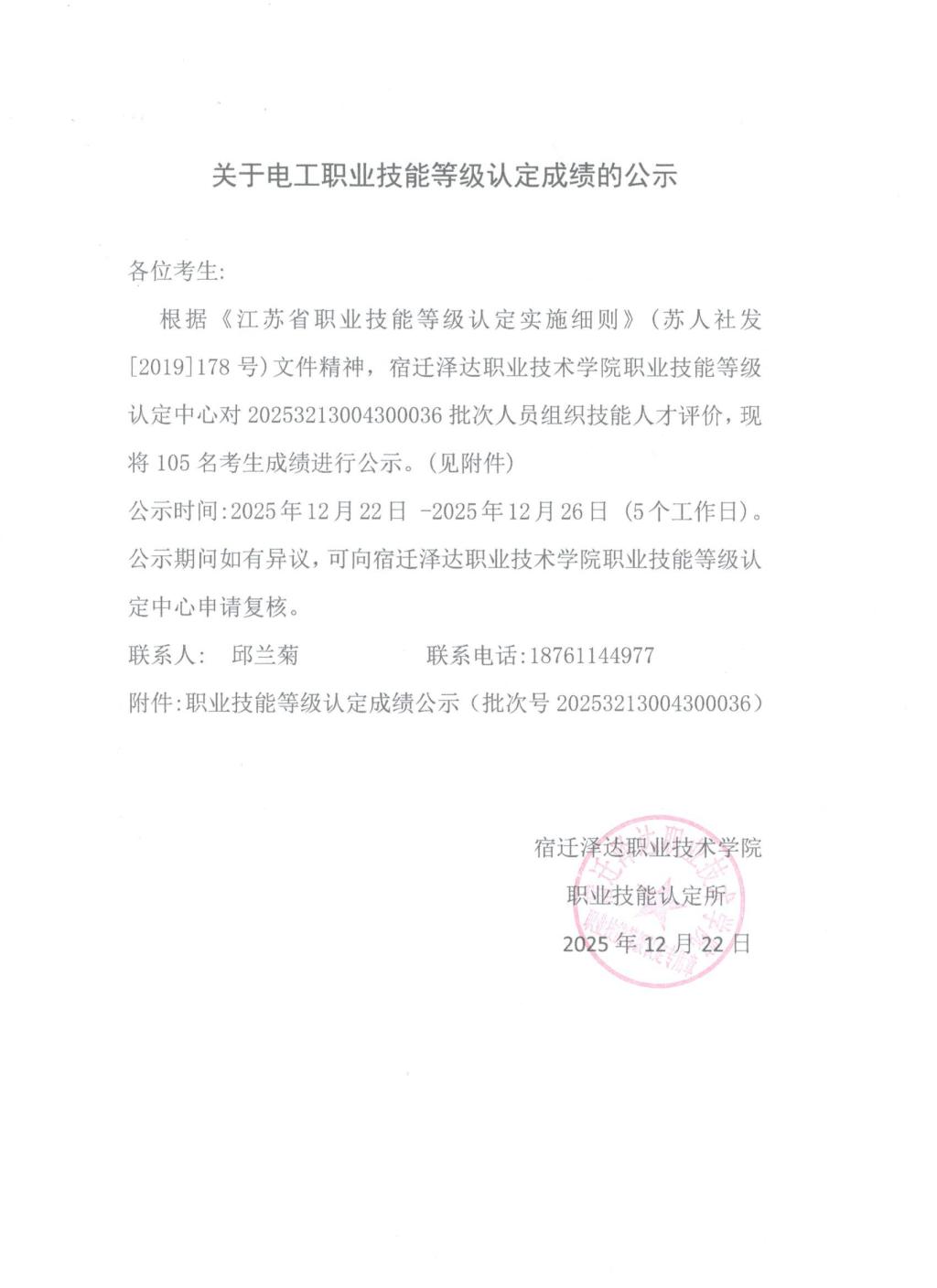 职业技能等级认定成绩公示(批次号2025-32130043-00036)