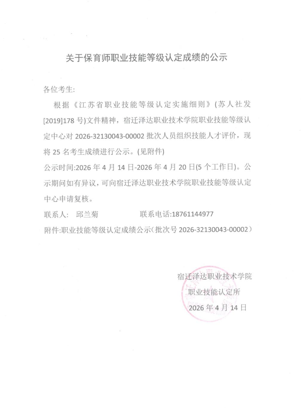 职业技能等级认定成绩公示(批次号2026-32130043-00002)