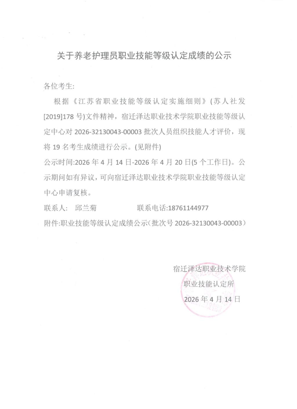 职业技能等级认定成绩公示(批次号2026-32130043-00003)