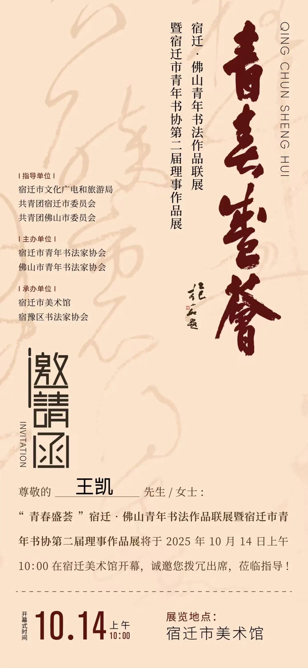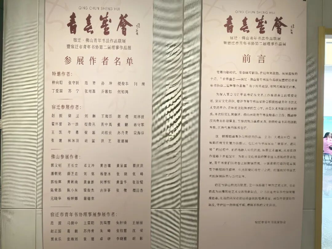 本次联展由宿迁市文化和广电旅游局、共青团宿迁市委员会、共青团佛山市委员会指导,宿迁市青年书法家协会、佛山市青年书法家协会主办,宿迁市美术馆、宿豫区书法家协会承办。佛山市书法家协会副主席郭文钊、黄显霖,宿迁市政协副主席刘培禄,宿迁市政协原二级巡视员、宿迁市发展促进会副会长仲向阳,宿迁市文化广电和旅游局党组书记、局长张智超,共青团宿迁市委副书记亓俊先,宿迁市画院院长张凡,宿迁市文联副主席、宿迁市美术馆馆长陆启辉,中国书法家协会楷书委员会委员、宿迁市书法家协会主席孙冲,中国书法家协会行书委员会委员、江苏省书法院专职书法家、宿迁市青年书法家协会名誉主席提俊丰等两地书法界代表出席开幕式。我校兰亭书法社师生与百余位书法爱好者共同参加开幕式。