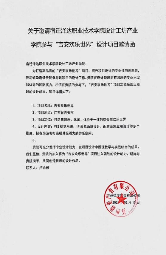 作为吉安市“十大攻坚战”重点项目,“吉安欢乐世界”由吉安城市建设投资开发有限公司负责打造,总投资9.1亿元、占地约18.13万平方米,涵盖奇幻小镇、动物王国、风暴湾等6大主题板块,是当地打造“娱乐+休闲+亲子体验”文旅地标的核心工程。2025年2月,项目承建方苏州德麦广告有限公司基于我校设计领域的专业积淀,正式发函邀请我校设计工坊产业学院参与项目设计,核心任务包括VIS视觉系统、IP形象系统及配套设施应用设计。